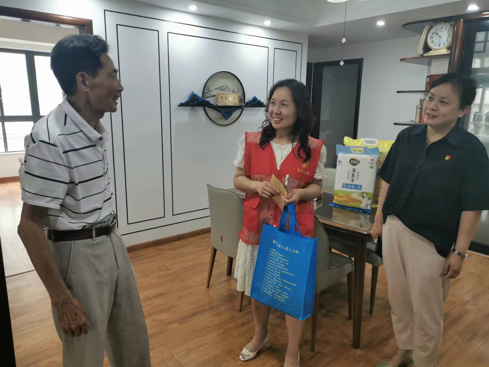 在天逸華庭小區(qū),志愿者們看望55年黨齡的老黨員甘黃興,關(guān)切地詢問他的家庭狀況、日常生活,表達(dá)對他多年發(fā)揮黨員先鋒模范作用、敬業(yè)奉獻(xiàn)的敬意,鼓勵他繼續(xù)弘揚(yáng)光榮傳統(tǒng),發(fā)揚(yáng)優(yōu)良作風(fēng),關(guān)心和支持社區(qū)工作。