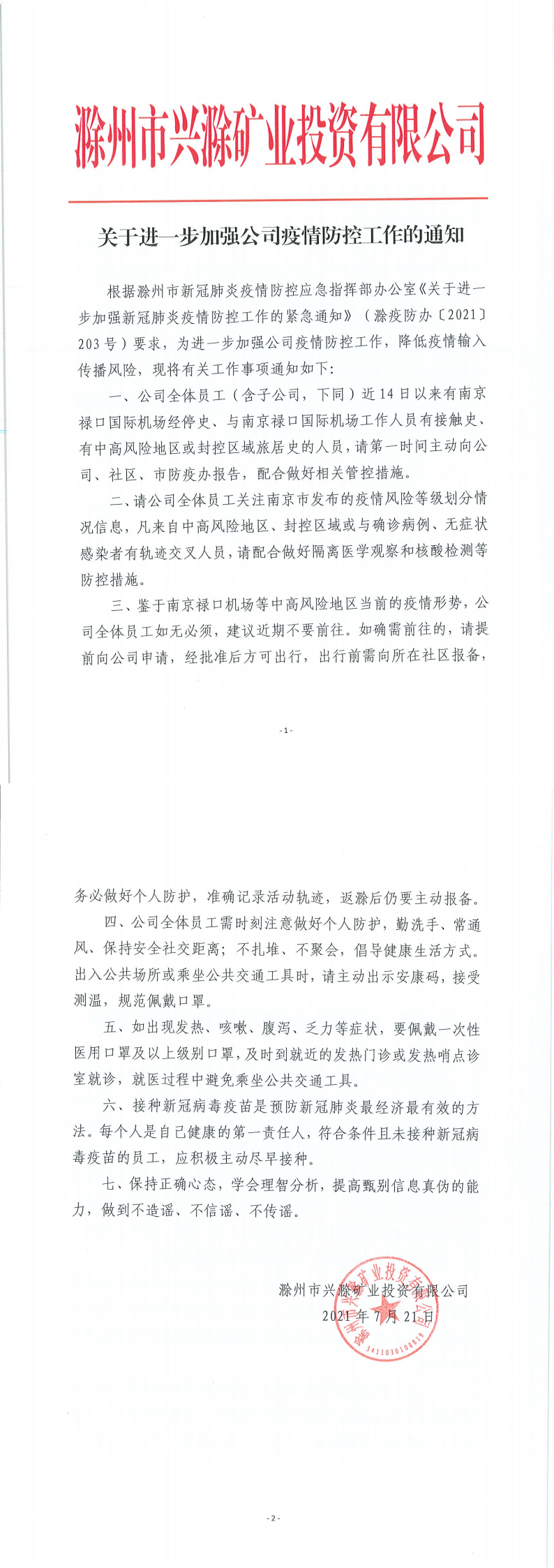 關于進一步加強公司疫情防控工作的通知