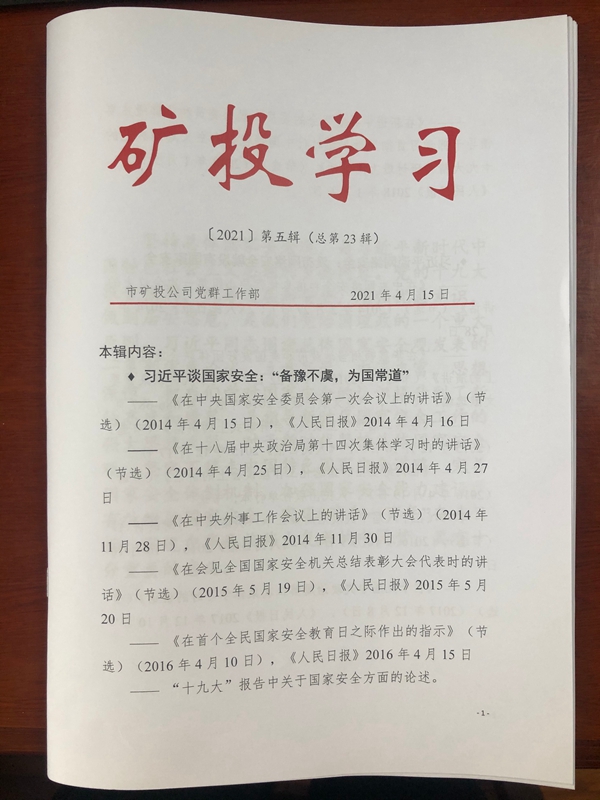 一是以《礦投學習》為載體,詳細整理了習近平總書記關于國家安全、網(wǎng)絡安全等方面的重要論述摘要,并印發(fā)至各部室、各子公司。有助于全部職工系統(tǒng)學習、理解、掌握習近平總書記關于總體國家安全觀的重要論述。