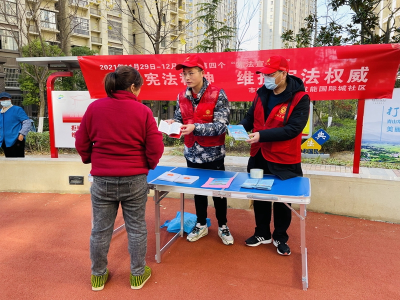今年的憲法宣傳主題為“以習近平法治思想為指引,堅定不移走中國特色社會主義法治道路”。在社區(qū)法治小廣場,志愿者向居民發(fā)放憲法宣傳手冊,講解國家憲法的由來、地位、主要內(nèi)容以及學習宣傳憲法的重要意義。
