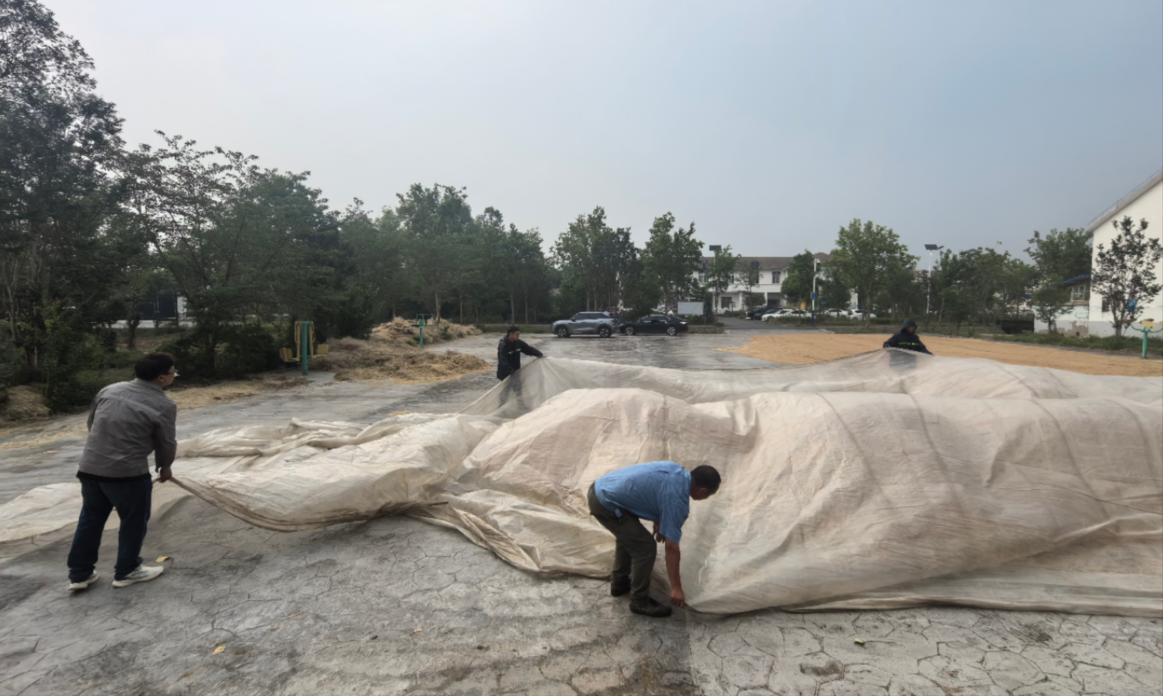 志愿者們拿起推糧鏟、鐵鍬、大掃帚,對糧堆邊緣散落的小麥進行集中歸攏,并迅速用防水雨布對糧堆進行覆蓋,有效防止因雨水滲透導致的糧食霉變損耗風險。